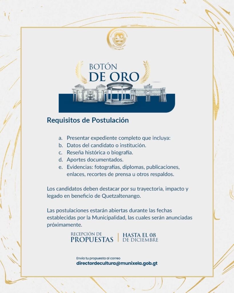 La Municipalidad de Quetzaltenango, liderada por el alcalde Juan Fernando López Fuentes, invita a presentar candidaturas para los prestigiosos premios Botón y Chivo de Oro 2025 de la Casa de la Cultura de Occidente. El objetivo es reconocer a personas que con su talento y dedicación, enriquezcan la cultura y el orgullo de la ciudad.