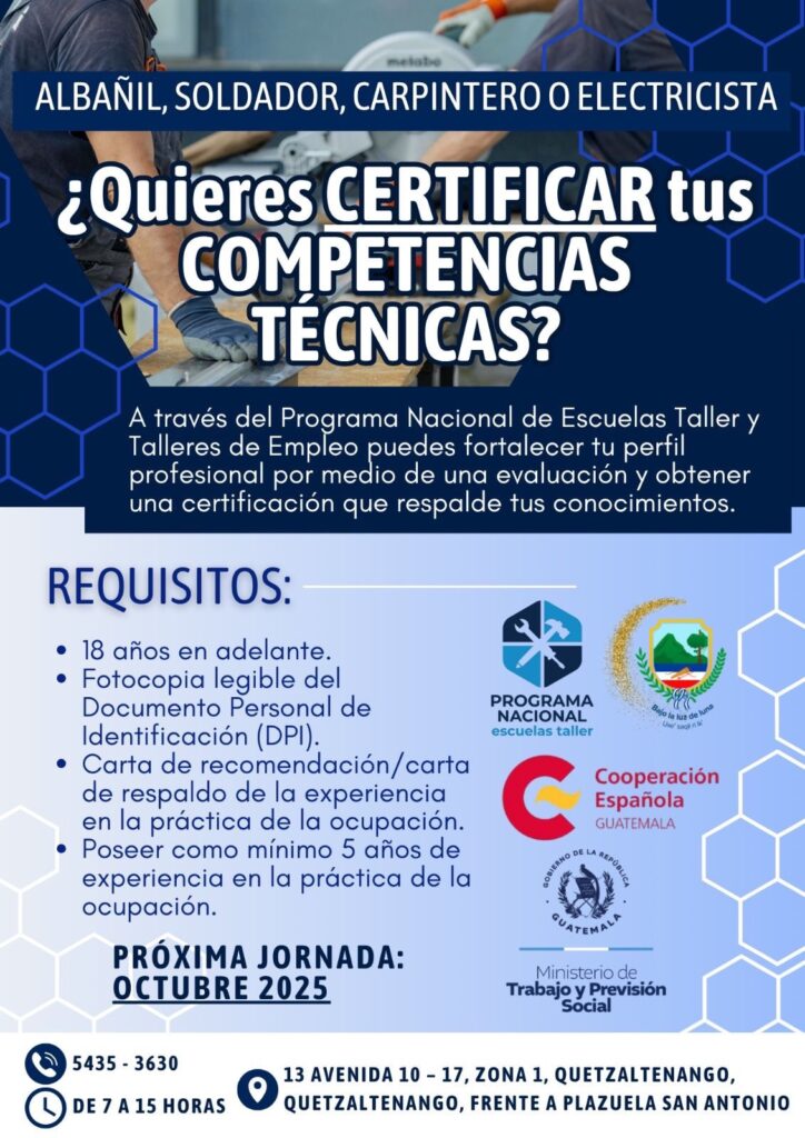 La Escuela Taller de Quetzaltenango llevará a cabo la segunda jornada de certificación de competencias laborales, avalada por el Ministerio de Educación, con el objetivo de promover la profesionalización de trabajadores con experiencia en oficios técnicos.