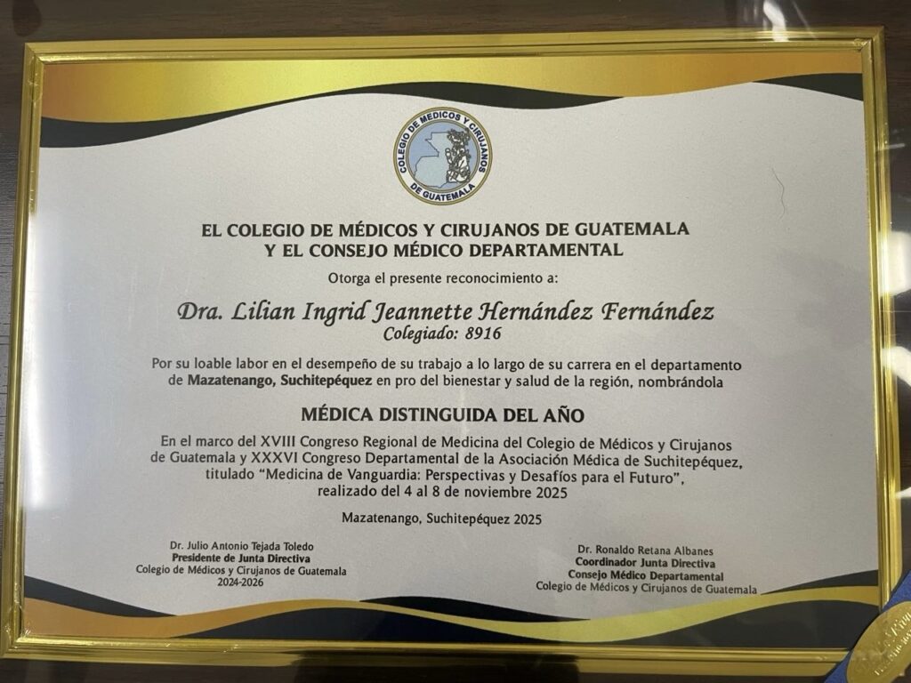 En el marco del XVIII Congreso Médico Regional del Colegio de Médicos y Cirujanos de Guatemala, celebrado recientemente en la ciudad de Mazatenango, se rindió un emotivo homenaje a la doctora Ingrid Hernández de Contreras, quien fue reconocida como Médica Distinguida del Año por su destacada trayectoria profesional tanto en el ámbito público como privado.