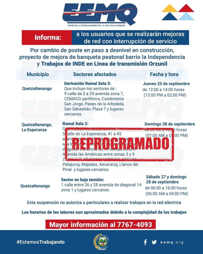 Domingo 28 de septiembre, de 07:00 a 16:00 horas: Zonas 1, 9 y 10 de Quetzaltenango, Centro Histórico, Valle de Palajunoj, Majadas, Xecaracoj, Llanos del Pinal, además de municipios como Huitán, Cabricán, Olintepeque, San Miguel Sigüilá, Cantel, Almolonga, Sibilia, San Carlos Sija, Salcajá, San Francisco La Unión, San Juan Ostuncalco y San Mateo.