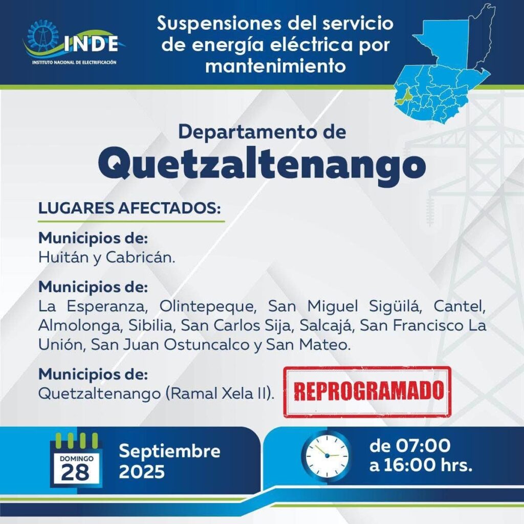 La suspensión responde a que el Instituto Nacional de Electrificación (INDE) decidió reprogramar las labores en líneas de transmisión, que estaban previstas para afectar el Ramal Xela II y otros sectores en baja tensión.