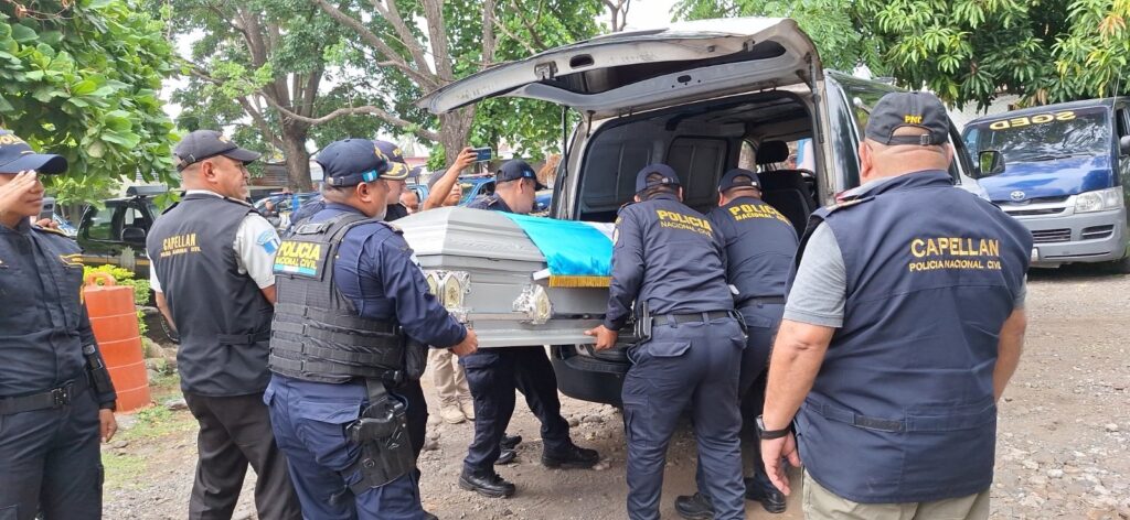 En el interior de la Comisaría 33, se realizaron las honras fúnebres en memoria del agente Esdras Josué Arreaga Escobar, quien falleció tras ser atacado con arma de fuego por desconocidos en colonia El Rosario, San Francisco Zapotitlán, Suchitepéquez.