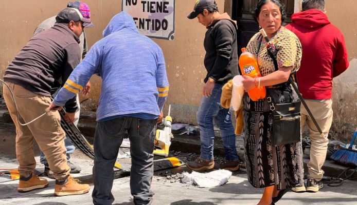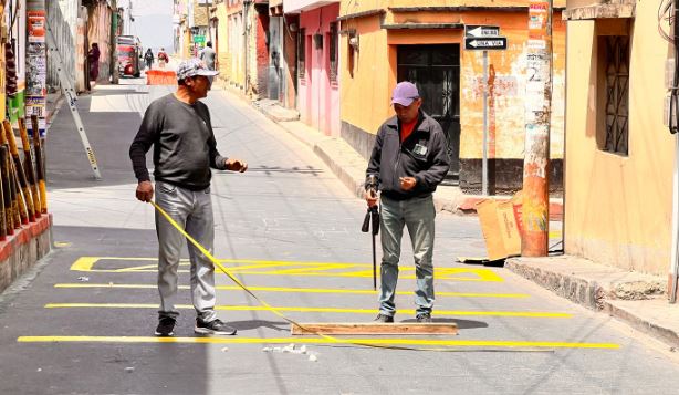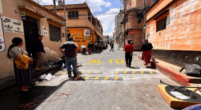 Autoridades y vecinos, en la zona 3 de Totonicapán, señalizan calle para prevenir accidentes de tránsito.