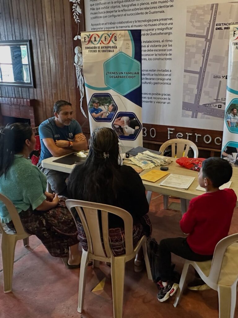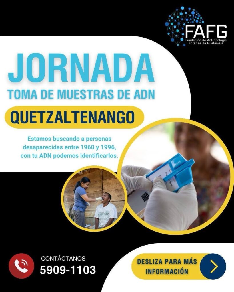 La Fundación de Antropología Forense de Guatemala (FAFG) desarrolla una jornada de toma de muestras de ADN en el Parque Intercultural de Quetzaltenango, con el objetivo de fortalecer los procesos de búsqueda, identificación y reunificación de personas desaparecidas durante el conflicto armado interno, ocurrido entre 1960 y 1996.