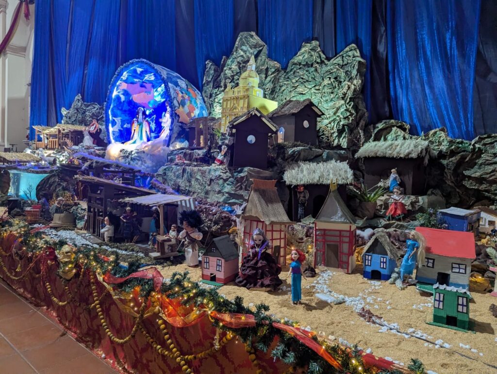 El nacimiento, elaborado cuidadosamente por miembros de la feligresía, destaca por sus detalles artesanales y el uso de elementos propios de la cultura local, como musgos, ramas, iluminación cálida y figuras tradicionales.