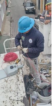 Este viernes, técnicos de alumbrado público de la Empresa Eléctrica Municipal de Quetzaltenango (EEMQ) trabajan en la 24 avenida y 9ª calle, zona 1 de Xela.