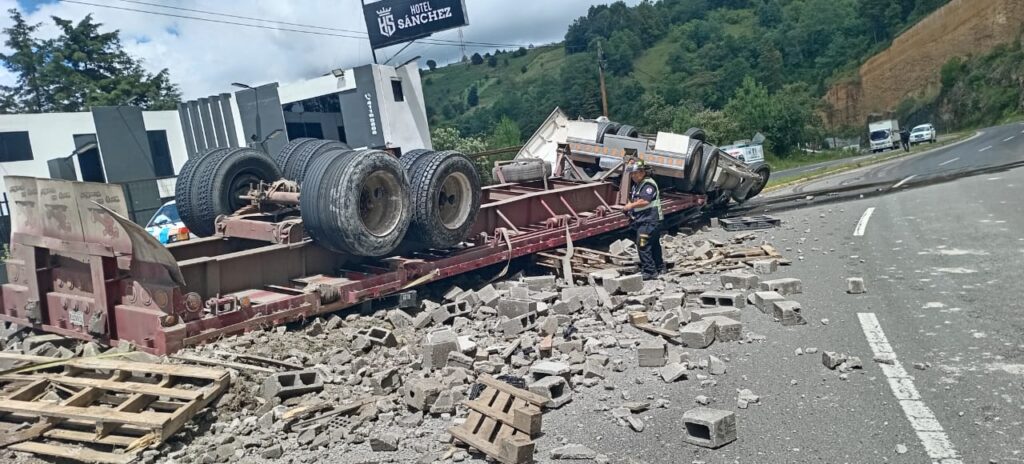 Este miércoles, Bomberos Voluntarios de la 42 Compañía de Totonicapán acuden al kilómetro 182 de la ruta Interamericana, donde volcó un tráiler que transportaba blocks.