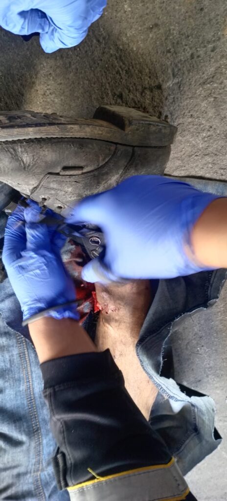 Por causas que se desconocen un hombre, de 33 años, sufre accidente laboral. Presenta una fractura expuesta en la pierna derecha.