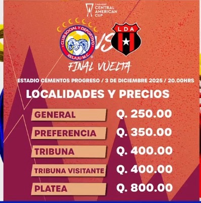 El club Xelajú MC dio a conocer este lunes los precios oficiales de las entradas para el partido de vuelta de la gran final de la Copa Centroamericana 2025, que se disputará el miércoles 3 de diciembre en el Estadio Cementos Progreso, en la Ciudad de Guatemala.