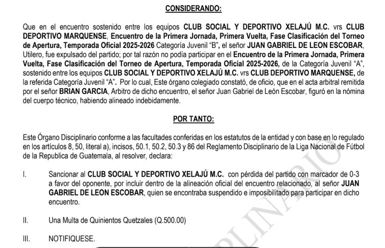 La categoría Juvenil B del Xelajú MC perdió tres puntos en la mesa luego de incluir en el partido al utilero Juan de León Escobar, quien arrastraba una suspensión desde el torneo anterior.