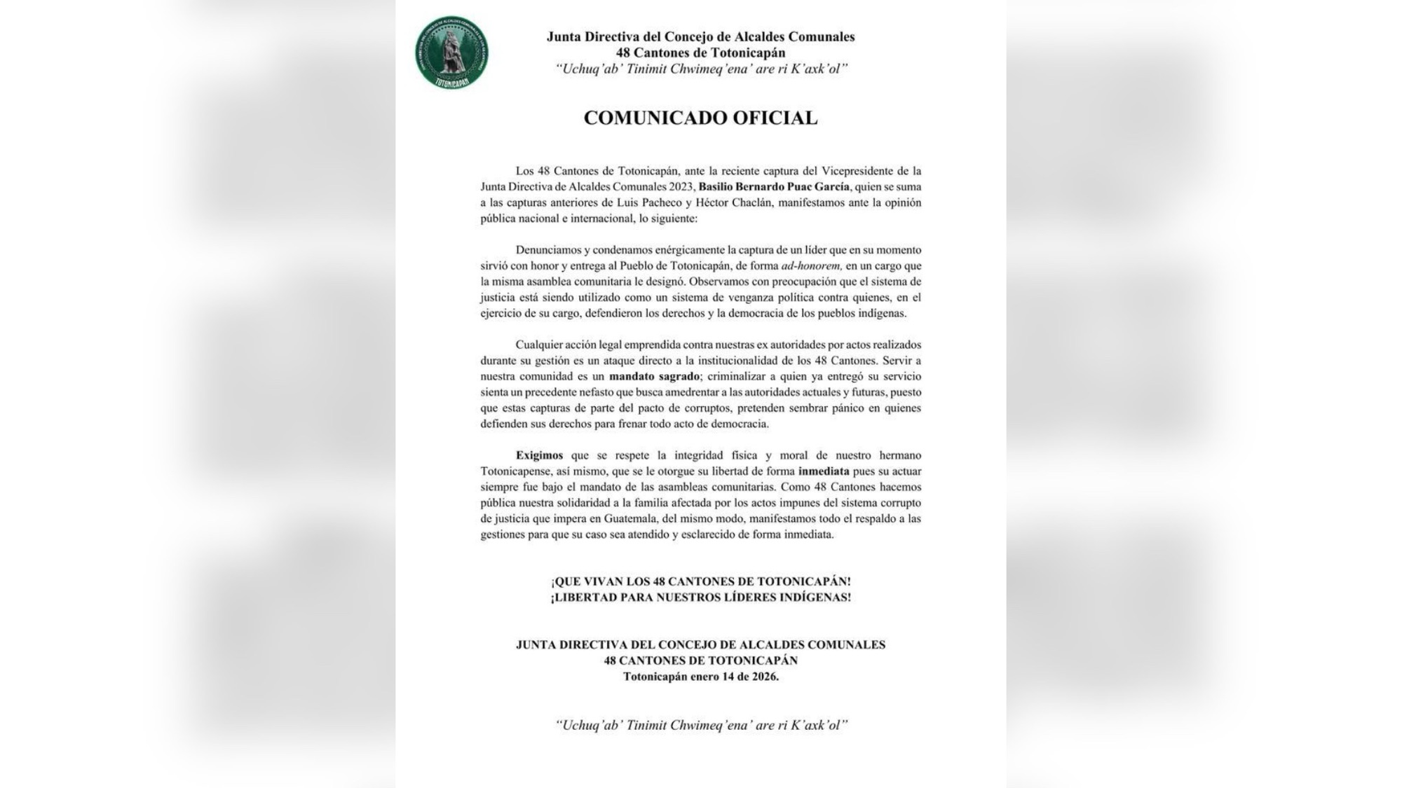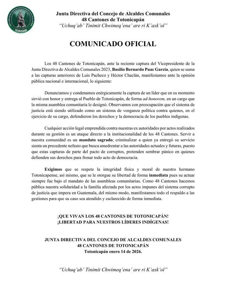 Totonicapán. — La Junta Directiva del Concejo de Alcaldes Comunales de los 48 Cantones de Totonicapán emitió un comunicado oficial en el que expresa su rechazo y condena a la captura de Basilio Bernardo Puac García, exvicepresidente de dicha Junta Directiva durante el año 2023.