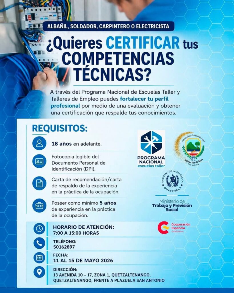 El Programa Nacional de Escuelas Taller y Talleres de Empleo anunció la apertura de una jornada para la certificación de competencias técnicas dirigida a trabajadores como albañiles, soldadores, carpinteros y electricistas en Quetzaltenango.