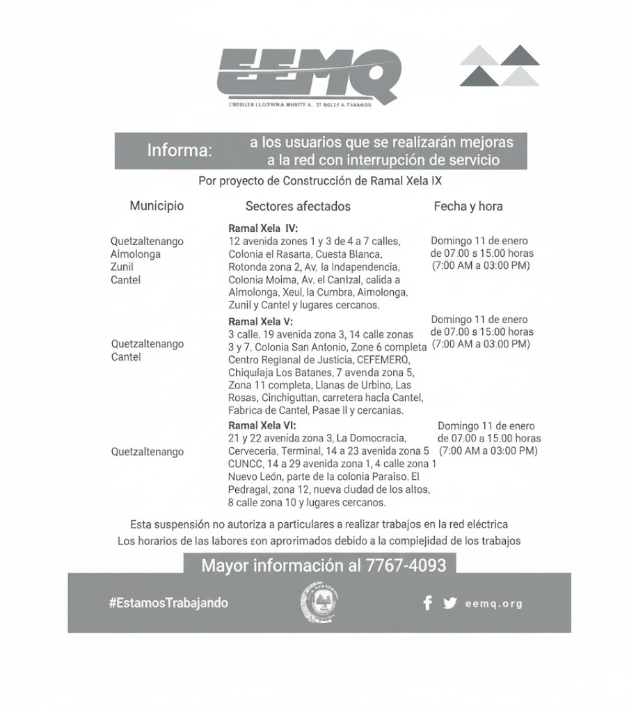 La Empresa Eléctrica Municipal de Quetzaltenango (EEMQ) anunció el primer corte programado de energía eléctrica del año 2026, el cual se realizará el domingo 11 de enero y afectará a distintos puntos de la ciudad de Quetzaltenango, así como a los municipios de Almolonga, Zunil y Cantel.