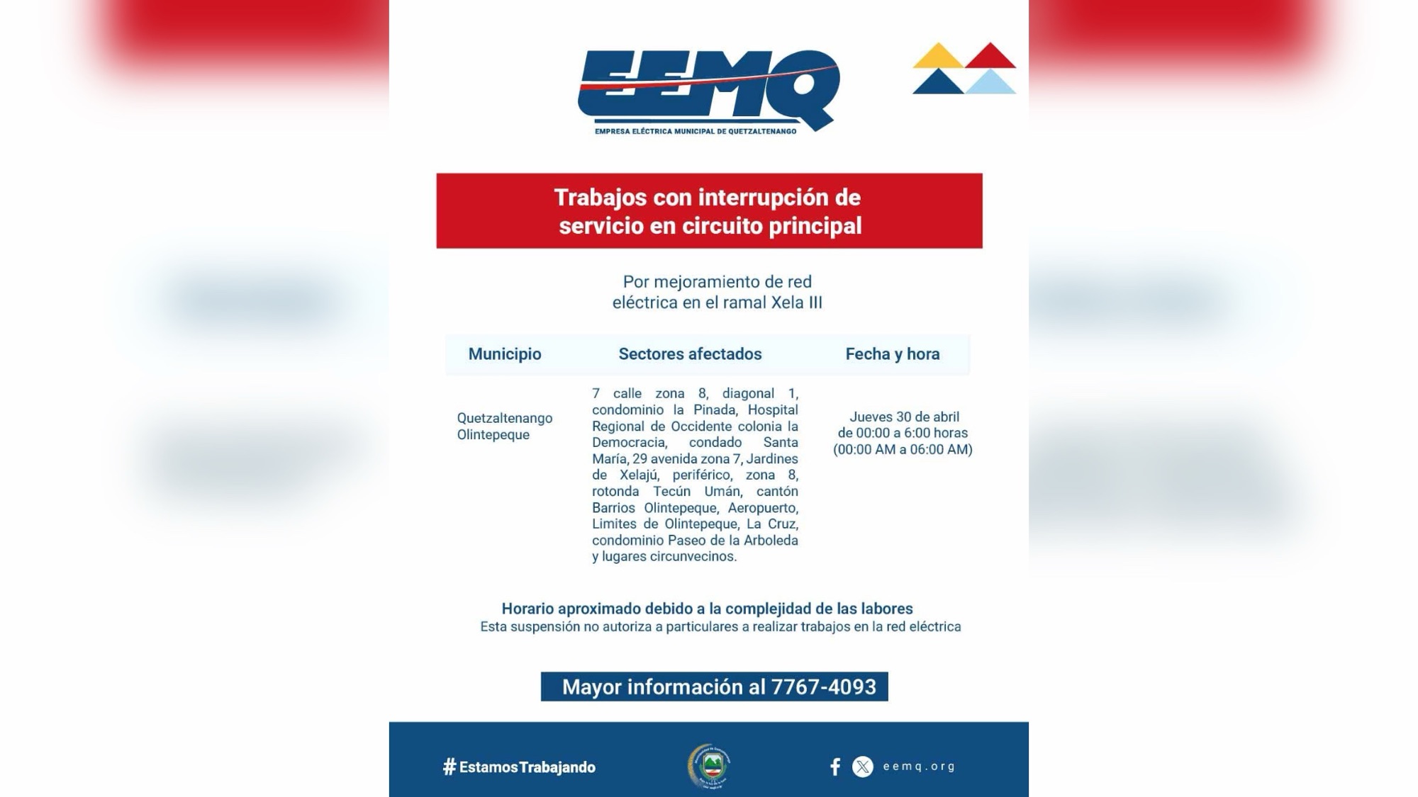 La Empresa Eléctrica Municipal de Quetzaltenango (EEMQ) informó que, debido a trabajos de mejora en la red del ramal Xela 3, se realizará una interrupción del servicio en el circuito principal este jueves 30 de abril, en horario de 00:00 a 6:00 horas.