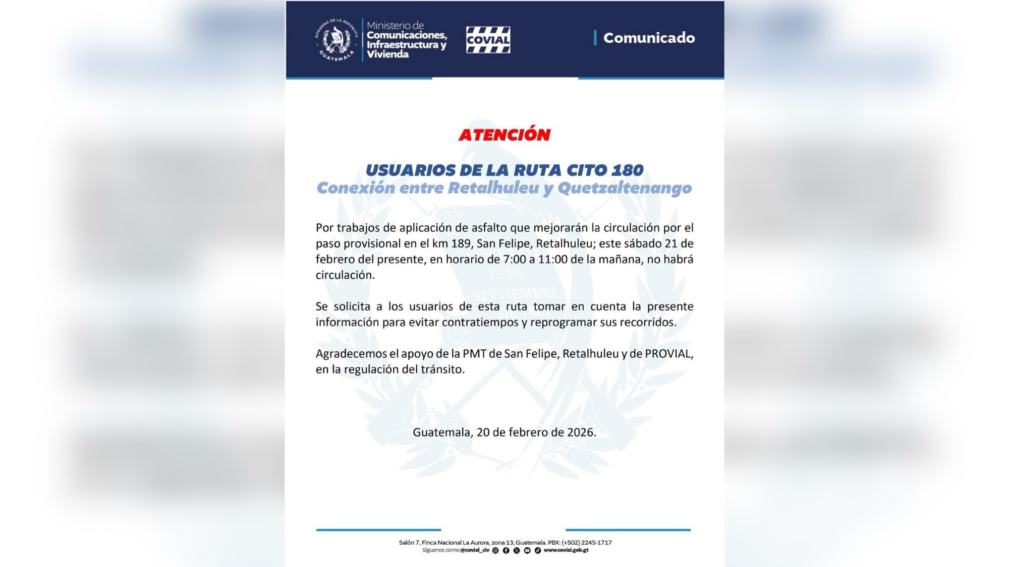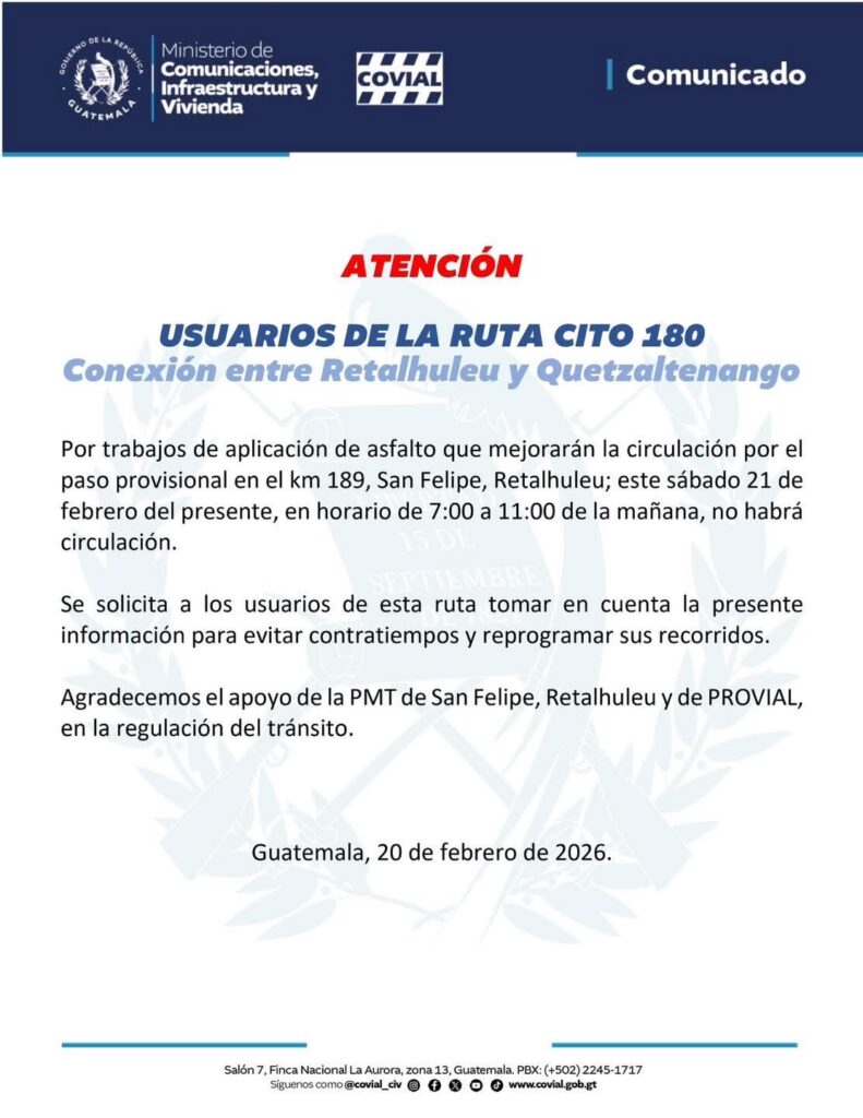 Las autoridades informaron que este 21 de febrero se aplicará una capa de asfalto en el paso alterno ubicado en el kilómetro 189 de la ruta CITO-180, como parte de los trabajos para mejorar la circulación vehicular en el sector.