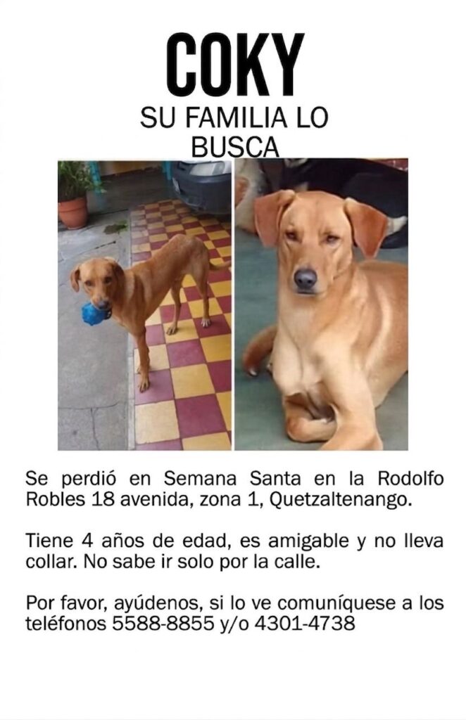 Se reporta la desaparición de COKY, un perrito de 4 años de edad, extraviado durante la Semana Santa en el sector de la Rodolfo Robles, 18 avenida, zona 1 de Quetzaltenango.