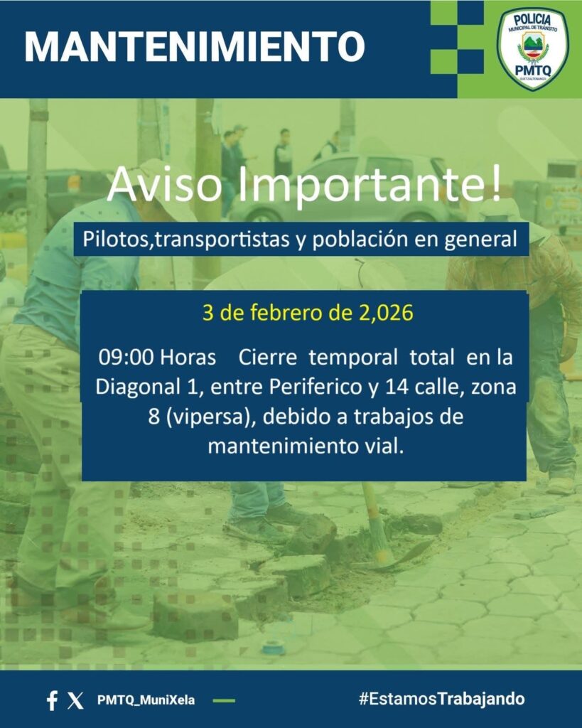 La Policía Municipal de Tránsito de Quetzaltenango (PMTQ) informó que este 3 de febrero, a partir de las 9:00 horas, se realizará un cierre temporal total en la Diagonal 1, entre Periférico y 14 calle, zona 8 (sector Vipersa), debido a trabajos de mantenimiento vial.