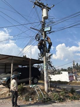 Técnicos de Alumbrado Público de la Empresa Eléctrica Municipal de Quetzaltenango (EEMQ) instalan lámparas en Chichigüitán.