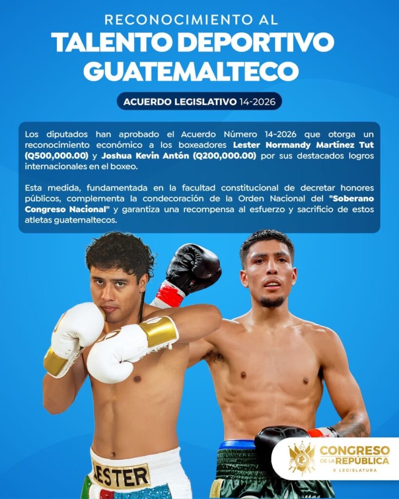El Congreso de la República aprobó la entrega de incentivos económicos para reconocer el desempeño de dos boxeadores guatemaltecos que obtuvieron títulos internacionales, con el respaldo de 81 diputados.