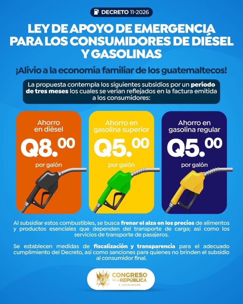Con el respaldo de 115 diputados, se aprobó el Decreto 11-2026 que otorga un «Apoyo Social Temporal» por tres meses. La medida, que requiere una inversión de Q2 mil millones, busca reducir directamente el precio final que paga el consumidor en la gasolinera.
