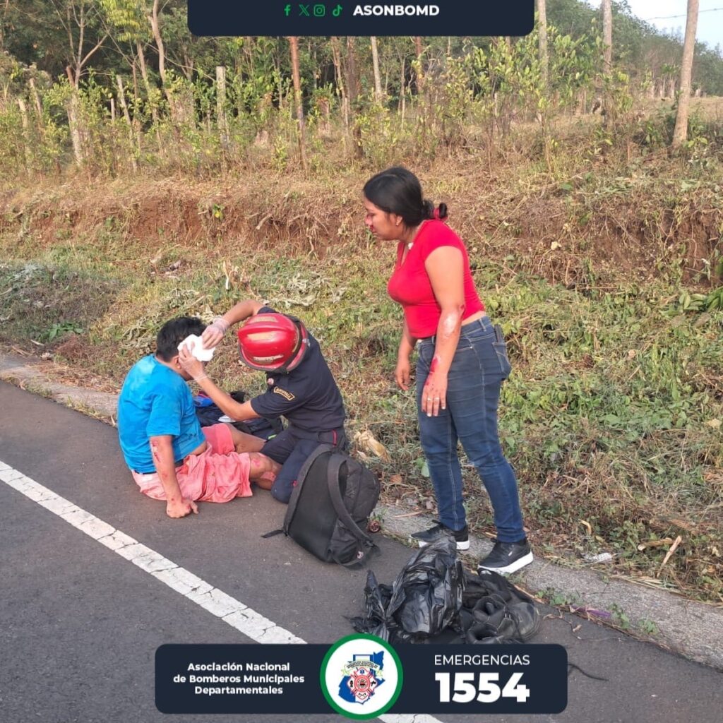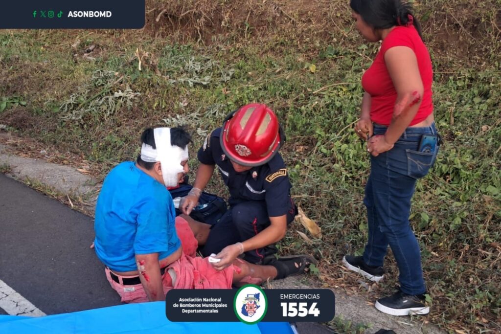 Al llegar al lugar, los socorristas brindaron atención prehospitalaria a dos personas identificadas como Mynor Cipriano, de 41 años, piloto de la motocicleta, quien presentaba múltiples hematomas en el cráneo, golpes y erosiones en distintas partes del cuerpo; y María del Carmen Juárez, de 20 años, quien sufrió golpes y erosiones en el rostro, así como lesiones en la parte posterior de la espalda.