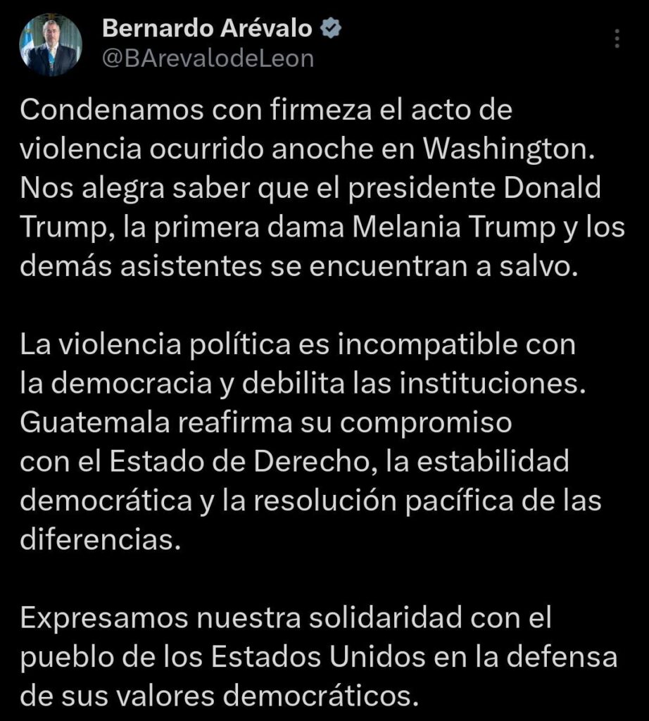 A través de un mensaje oficial, el presidente de la República, Bernardo Arévalo de León, manifestó su rechazo absoluto al reciente hecho de violencia ocurrido en Washington que puso en riesgo la vida del expresidente estadounidense.