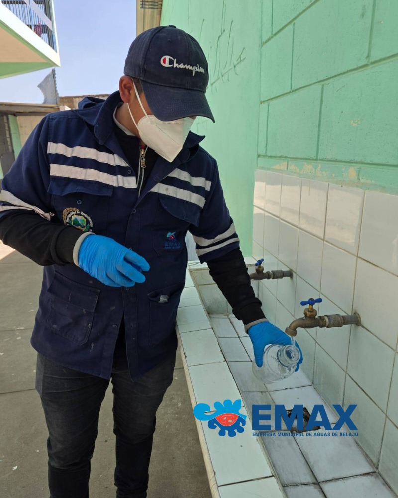 Personal del Laboratorio de la Calidad del Agua de la Empresa Municipal Aguas de Xelajú (EMAX), este viernes, desarrolla controles de la calidad del agua en 46 centros educativos de Quetzaltenango.