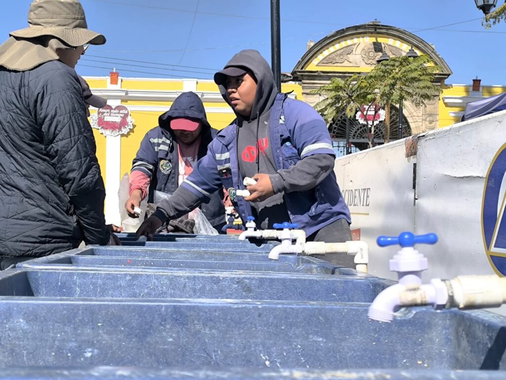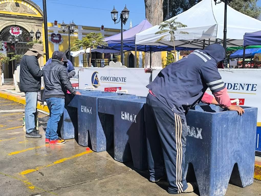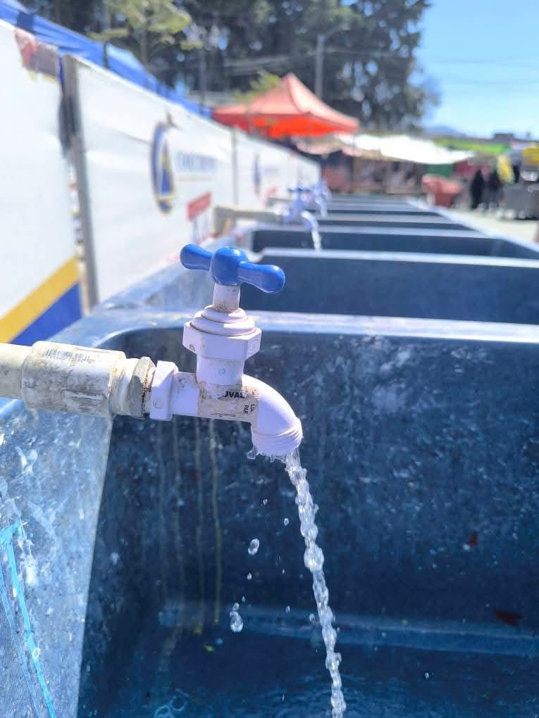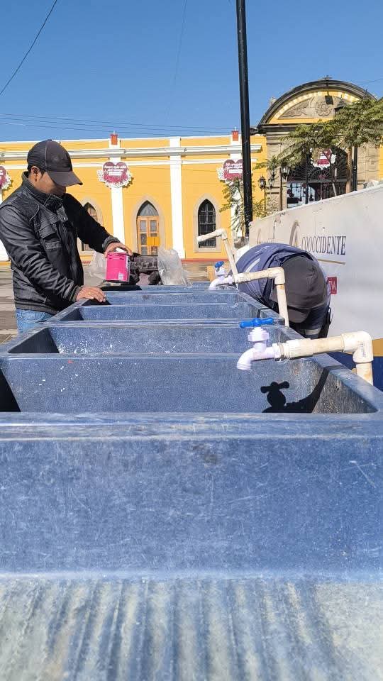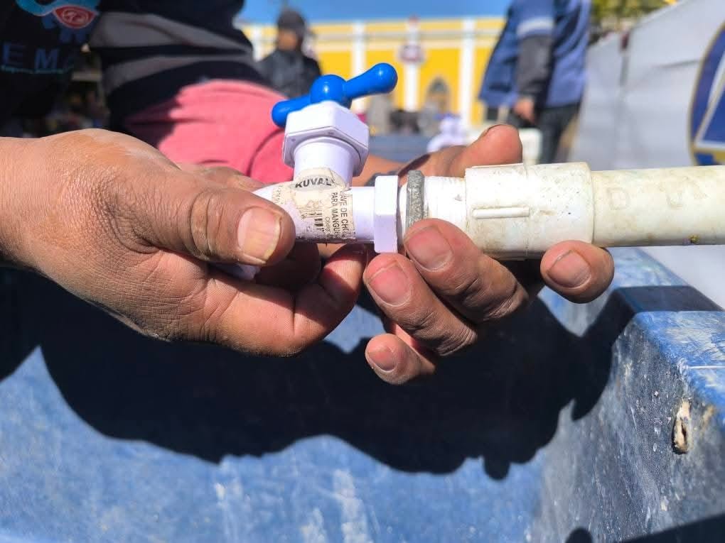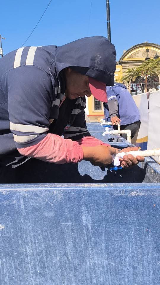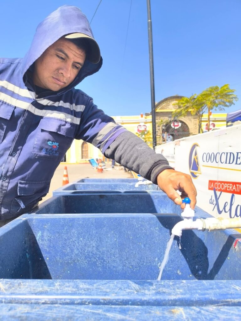 Este lunes, por la feria cantonal del Primer Viernes de Cuaresma en el barrio El Calvario, zona 1 de Quetzaltenango, personal de la Empresa Municipal Aguas de Xelajú (EMAX) instala pilas para garantizar el acceso al agua potable para los vendedores instalados en el sector.