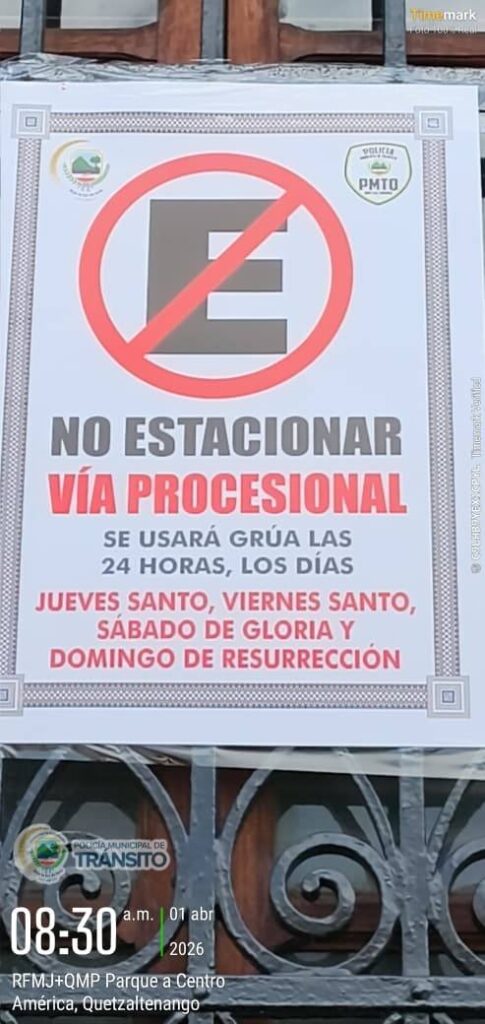 La Policía Municipal de Tránsito de Quetzaltenango (PMTQ) hace un llamado a la población para respetar las áreas restringidas durante la Semana Santa 2026. Los vehículos estacionados en recorridos oficiales serán movilizados con grúa.