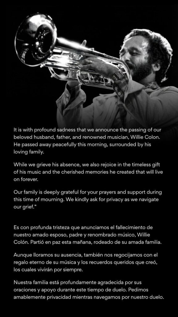 “Es con profunda tristeza que anunciamos el fallecimiento de nuestro amado esposo, padre y renombrado músico, Willie Colón. Partió en paz esta mañana, rodeado de su amada familia”, señala el mensaje difundido en redes sociales.