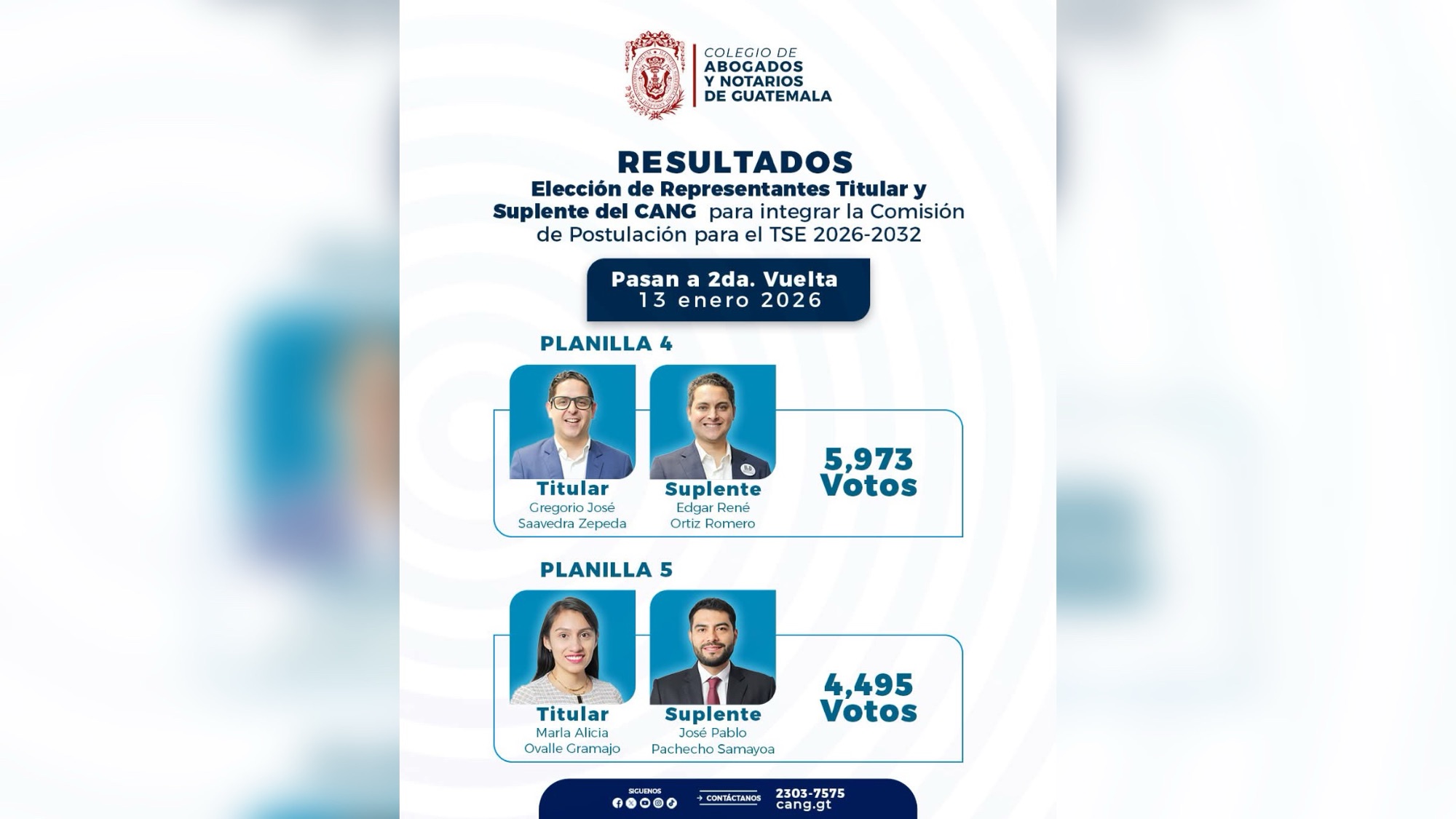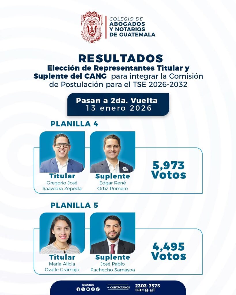 Según lo establecido en la normativa del CANG, las dos planillas con mayor número de votos avanzan a la siguiente fase.