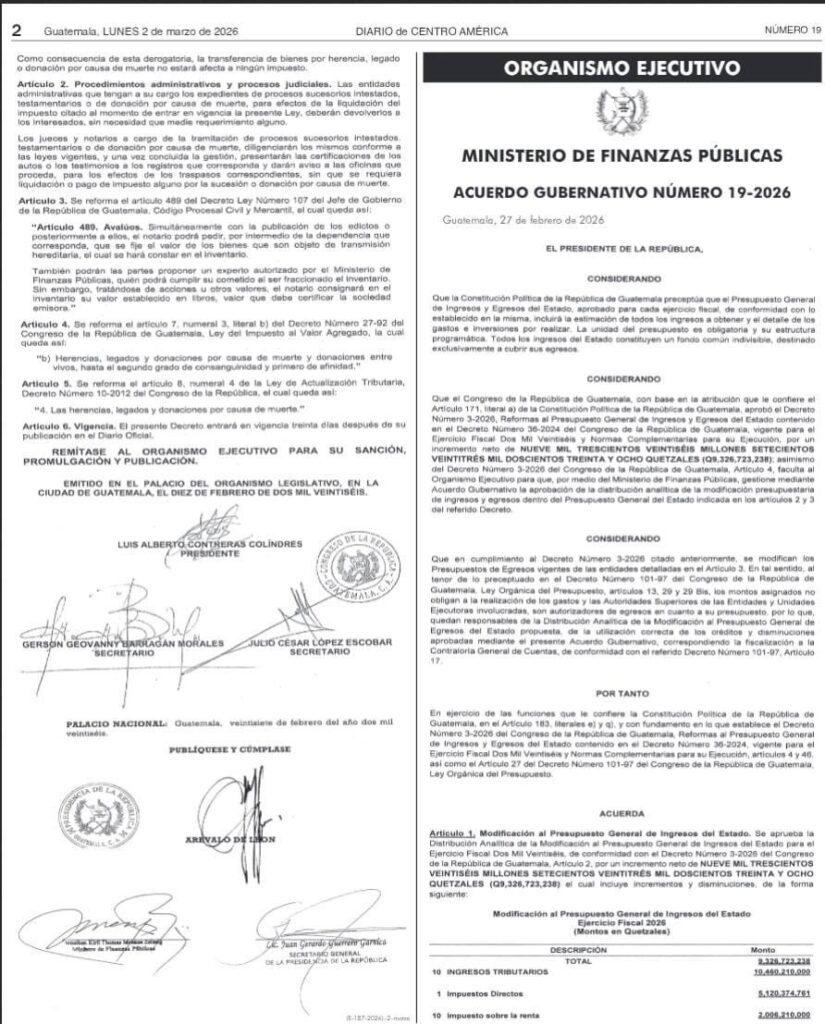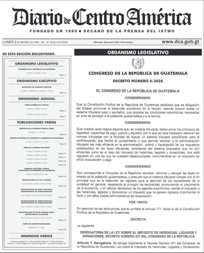 En un giro trascendental para el sistema tributario del país, el Diario de Centro América oficializó este lunes el Decreto 06-2026, el cual deroga el Impuesto sobre Herencias, Legados y Donaciones. Esta medida no solo elimina el pago directo de este tributo, sino que simplifica radicalmente los procesos sucesorios en Guatemala.