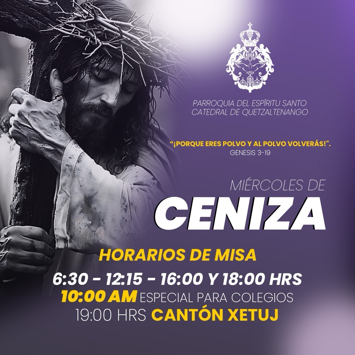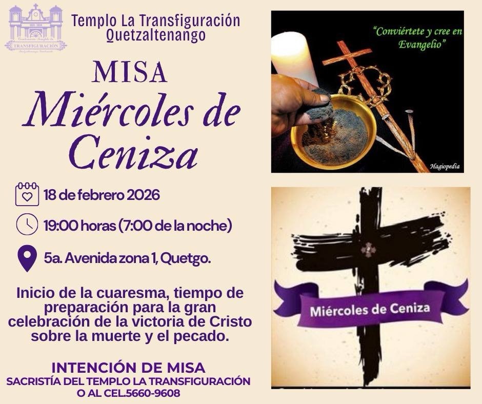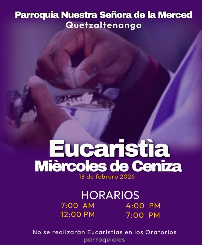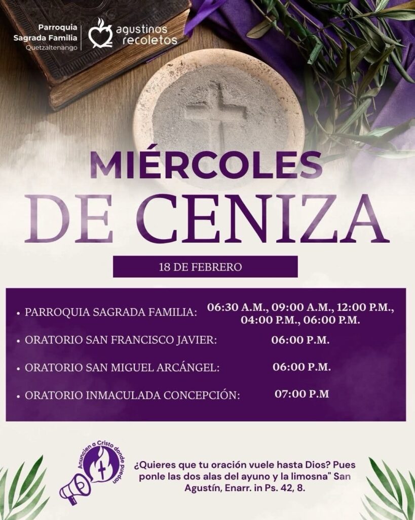 Se informa a la feligresía católica de Quetzaltenango sobre los horarios y parroquias en los que se celebrará la Santa Eucaristía con imposición de Ceniza, con motivo del Miércoles de Ceniza, inicio del tiempo litúrgico de Cuaresma.