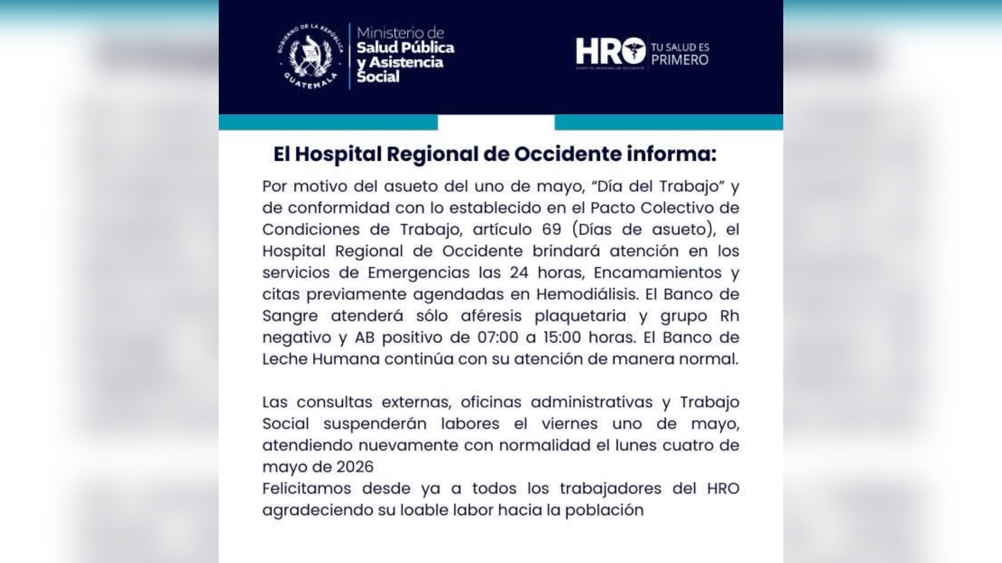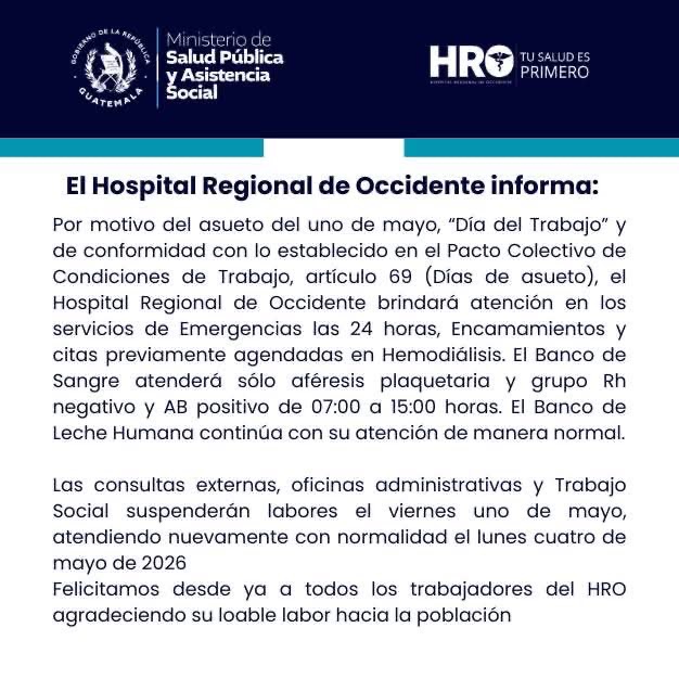 El Hospital Regional de Occidente informó a la población que, con motivo del asueto del Día del Trabajo, este viernes 1 de mayo se suspenderán labores en el área administrativa y en algunos servicios.