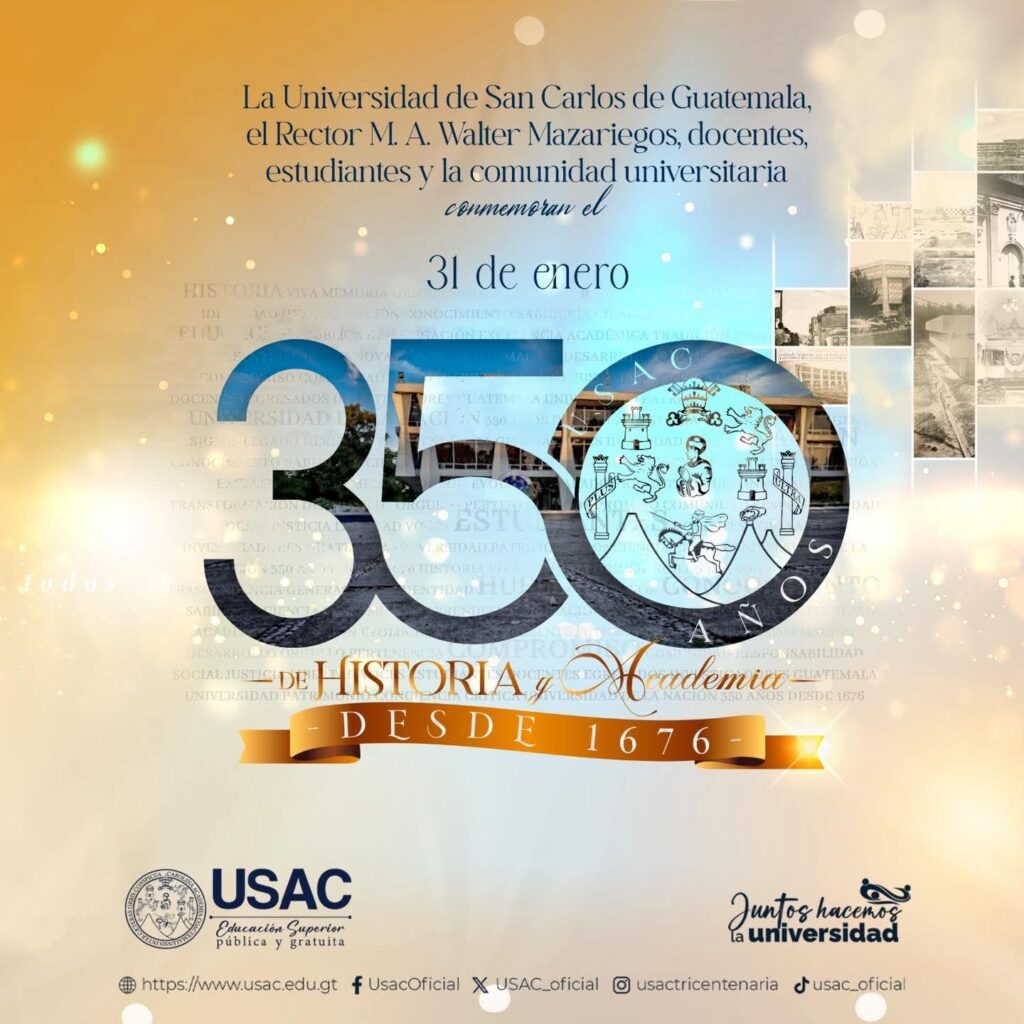 Un 31 de enero de 1676 fue fundada la Universidad de San Carlos de Guatemala (USAC), convirtiéndose en la institución de educación superior más antigua del país y la única universidad estatal. Con 347 años de historia, la USAC ha sido un pilar fundamental en la formación académica, científica y cultural de Guatemala.