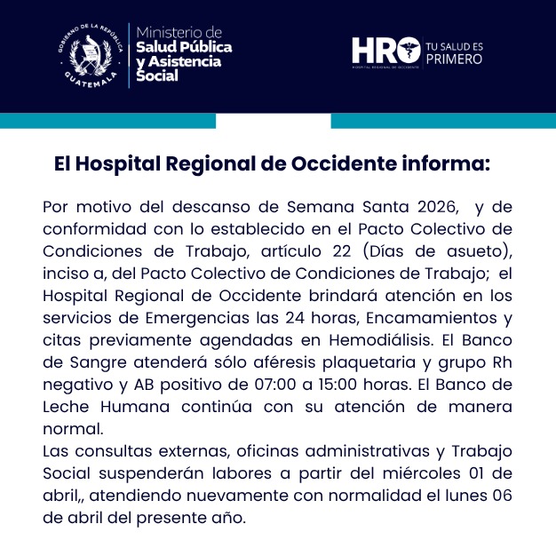 Por medio de un comunicado, el Hospital Regional de Occidente (HRO) de Quetzaltenango informa de descanso y emergencias en Semana Santa.