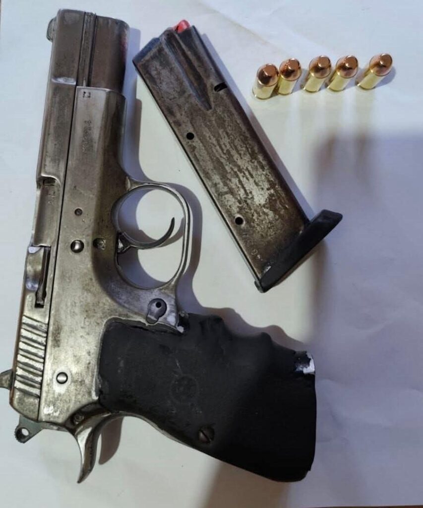 Evidencia incautada: Al momento de su aprehensión, le fue localizada una pistola sin marca ni registro visible, un cargador y cinco municiones útiles.