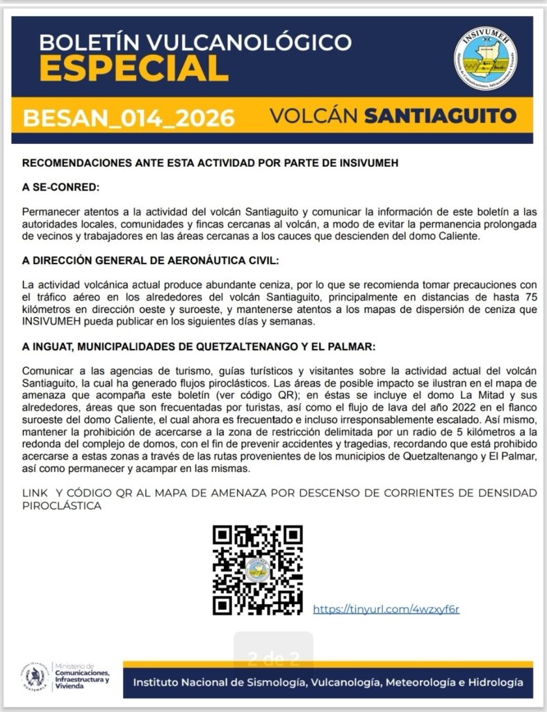 El Instituto Nacional de Sismología, Vulcanología, Meteorología e Hidrología (INSIVUMEH) emitió un boletín vulcanológico especial por la actividad del volcán Santiaguito, en el que dirige recomendaciones específicas a distintas instituciones para prevenir riesgos.