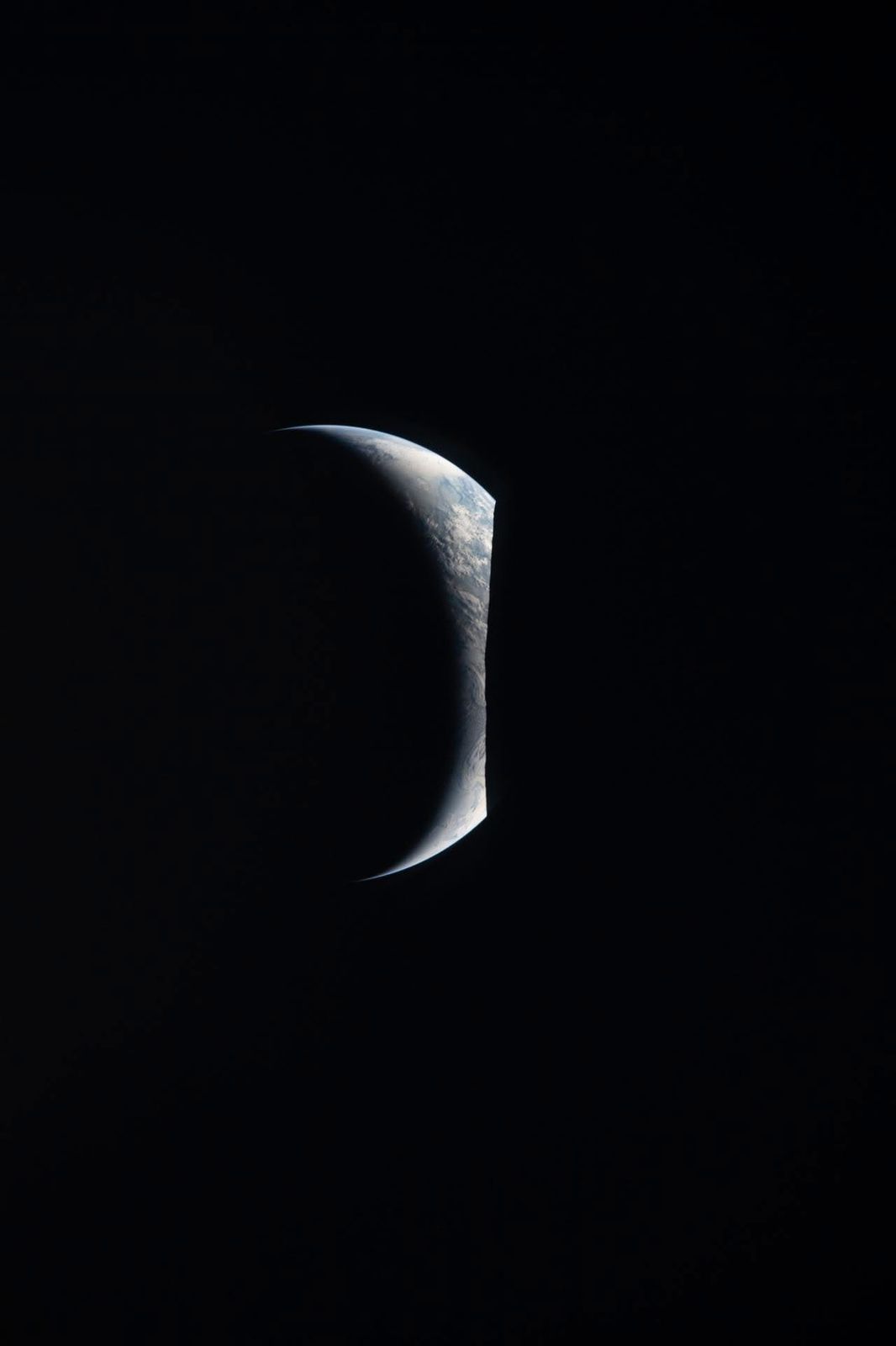 La Tierra aparece como una delicada media luna. El suave tono azul del planeta y los sistemas de nubes blancas dispersos destacan en la oscuridad del espacio. A lo largo del horizonte lunar, un terreno accidentado es silueta contra la brillante media luna de la Tierra.