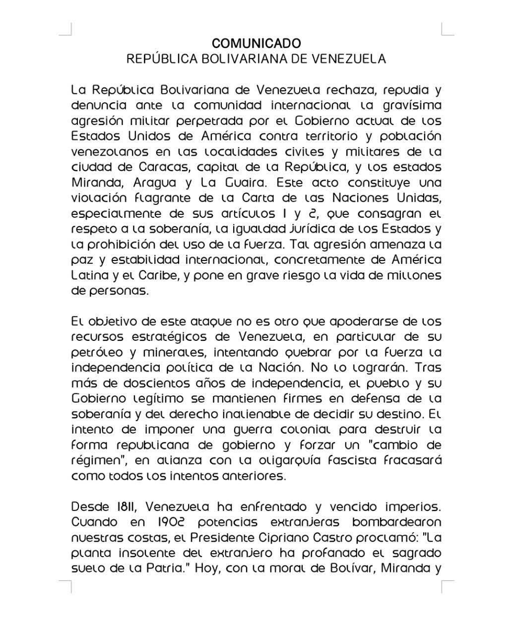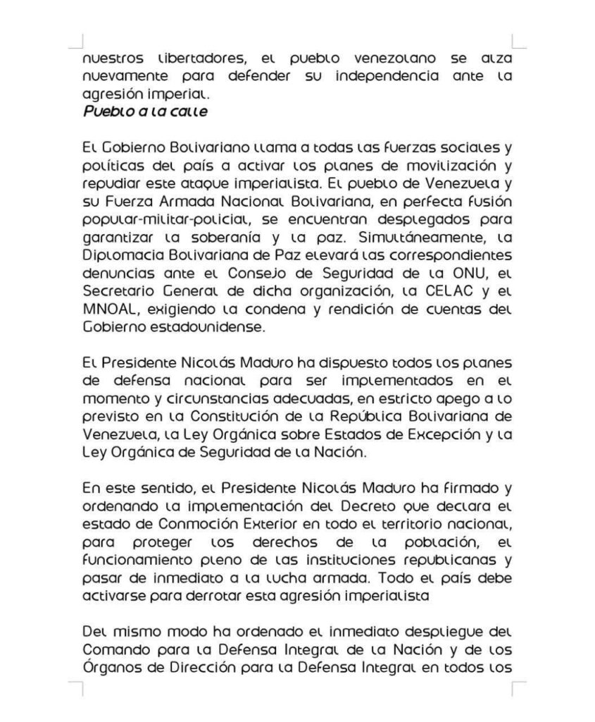 En su primer comunicado oficial desde el inicio de los bombardeos reportados por la población, Maduro afirmó que la medida se adopta con el propósito de “proteger los derechos de la población, garantizar el funcionamiento pleno de las instituciones republicanas y pasar de inmediato a la lucha armada”.