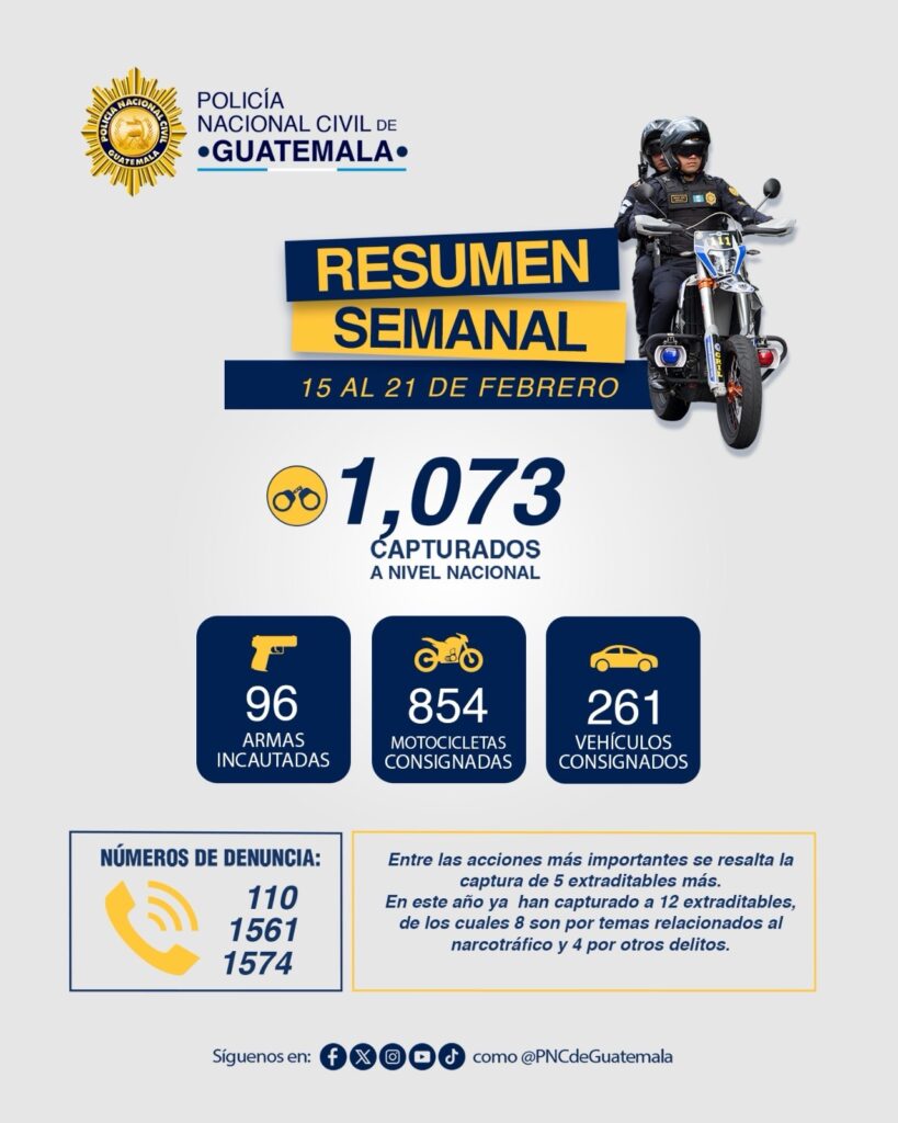 Durante la semana del 15 al 21 de febrero fueron capturadas 1,073 personas a nivel nacional, como parte de los operativos desarrollados por las fuerzas de seguridad.