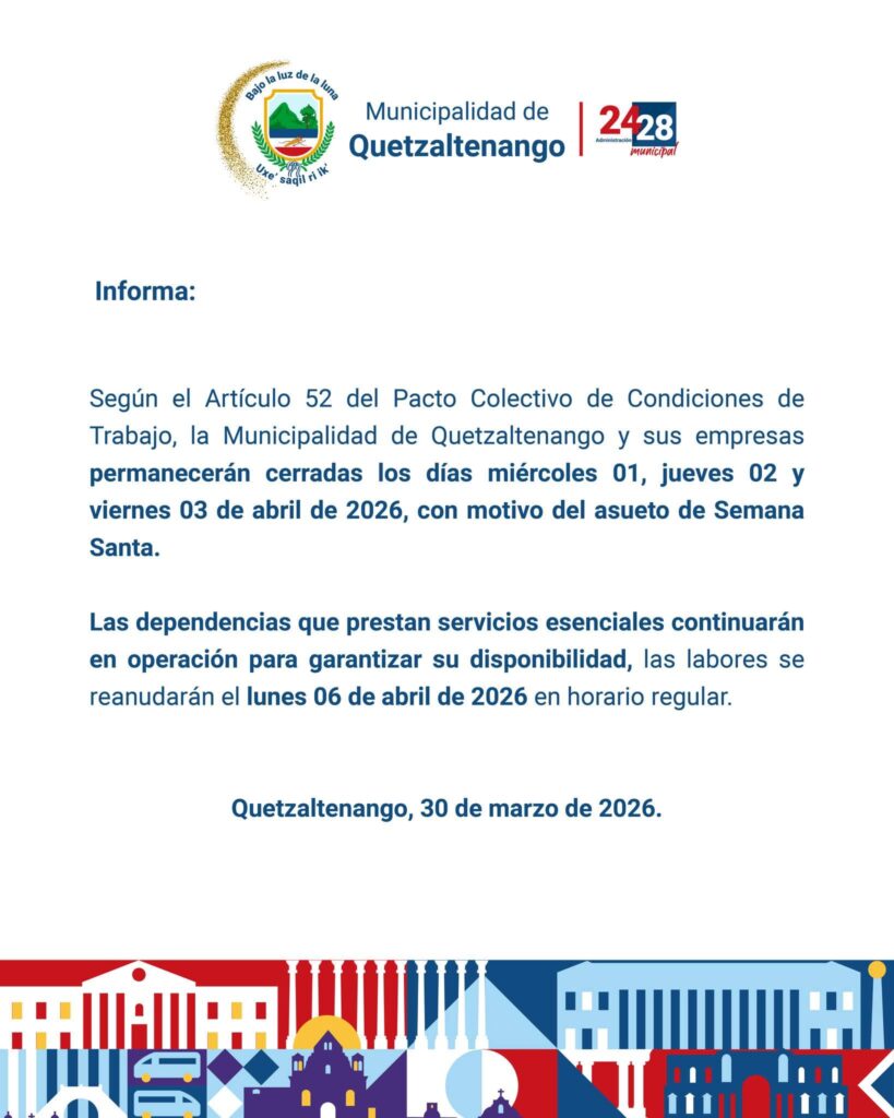 La Municipalidad de Quetzaltenango informó que, con motivo del asueto de Semana Santa, sus oficinas y empresas municipales permanecerán cerradas Miércoles, Jueves y Viernes Santo.