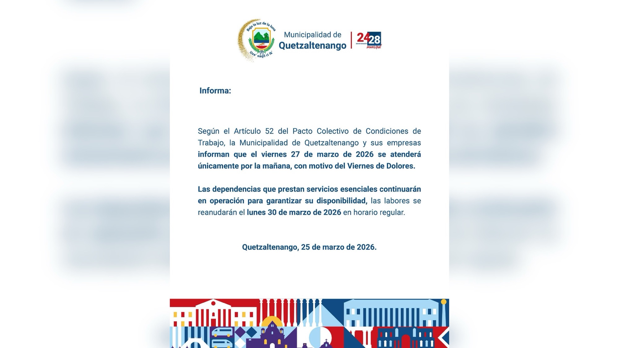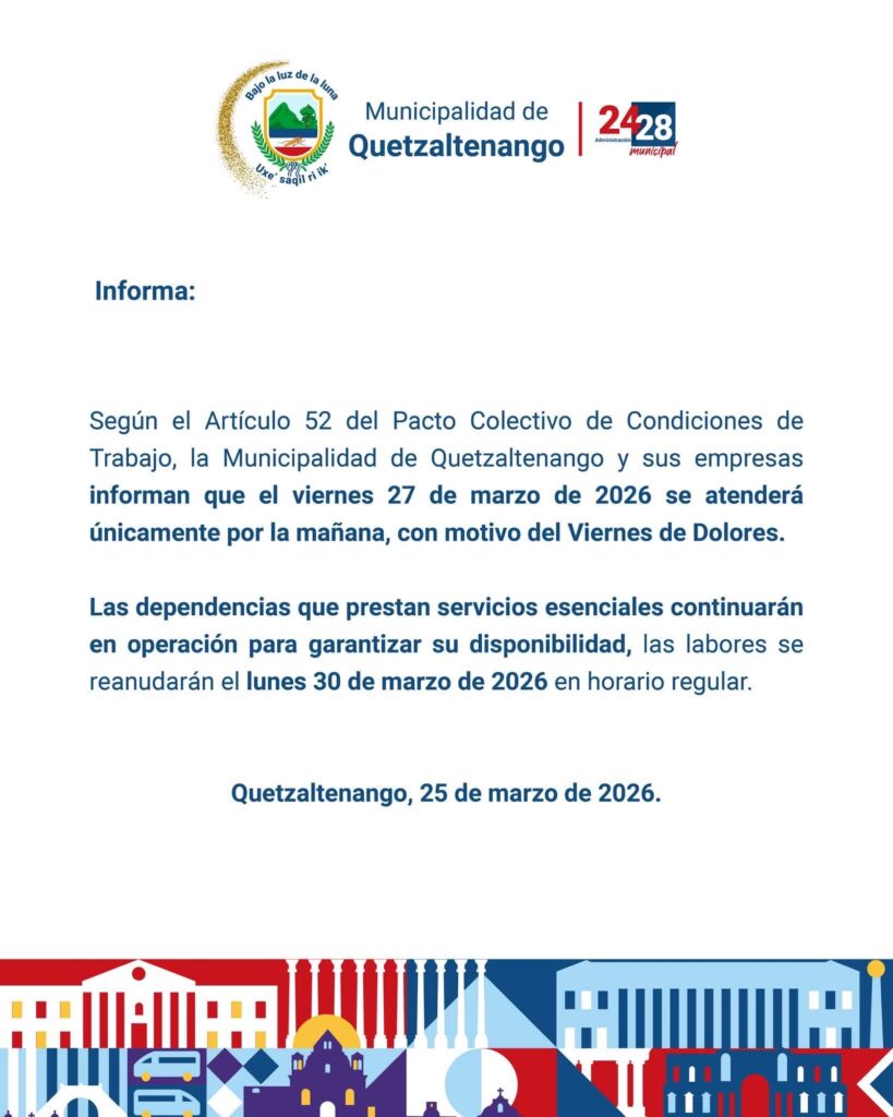 La Municipalidad de Quetzaltenango informó que este viernes 27 de marzo de 2026 brindará atención únicamente en jornada matutina, por motivo del Viernes de Dolores, una de las fechas más representativas de la Cuaresma.