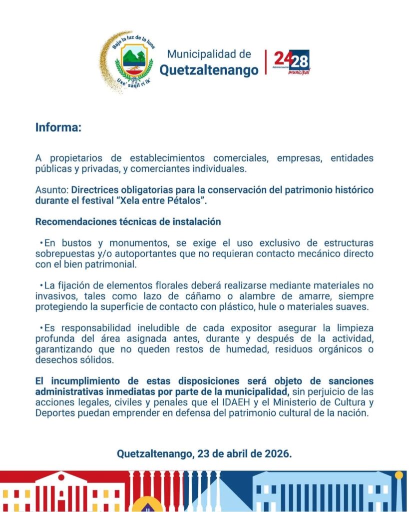 La Municipalidad de Quetzaltenango informó a propietarios de comercios, empresas, entidades públicas y privadas, así como a comerciantes individuales, sobre una serie de disposiciones obligatorias para la conservación del patrimonio histórico durante el festival “Xela entre Pétalos”.