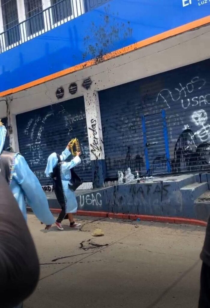 El incidente ocurrió mientras la columna universitaria avanzaba con sus tradicionales carrozas y disfraces hacia el parque central. Al llegar frente a la distribuidora, un grupo de participantes utilizó pintura en aerosol para escribir mensajes de rechazo a las tarifas eléctricas y la calidad del servicio en la región de la Costa Cuca.