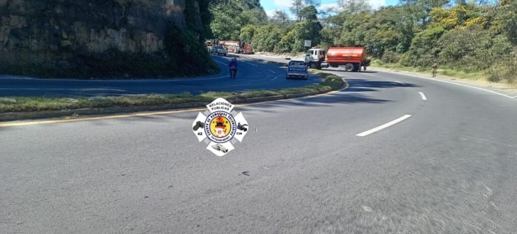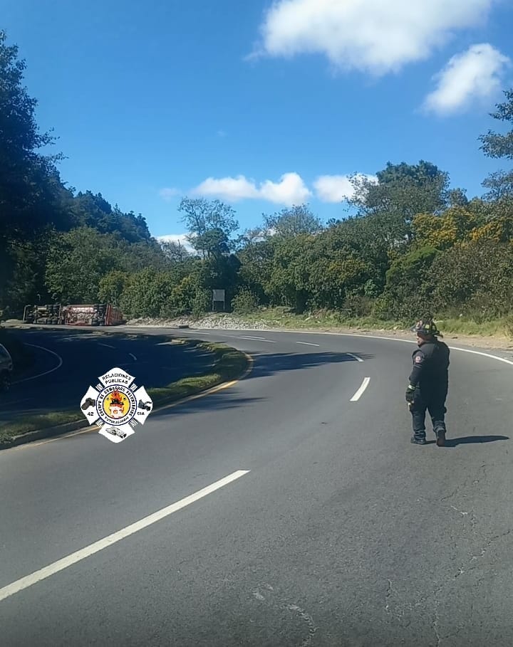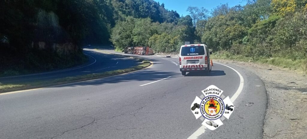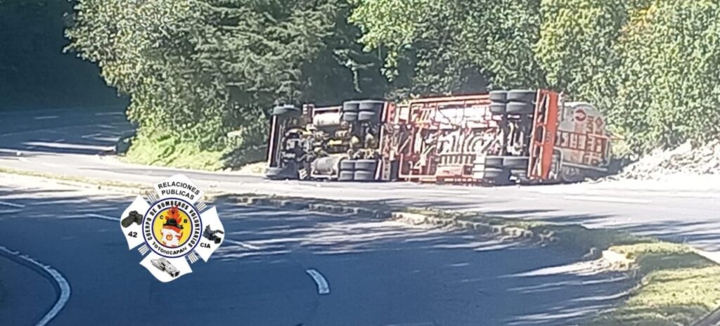 Este jueves, Bomberos Voluntarios de la 42 Compañía de Totonicapán reportan pipa, con combustible, volcada en el kilómetro 172 de la Ruta Interamericana.