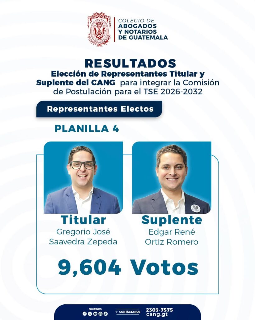 La planilla 4, integrada por Gregorio Saavedra y Edgar Ortiz, se impuso en la segunda vuelta de votaciones del Colegio de Abogados y Notarios de Guatemala (CANG) para conformar la Comisión de Postulación encargada de proponer a los candidatos a magistrados del Tribunal Supremo Electoral (TSE).