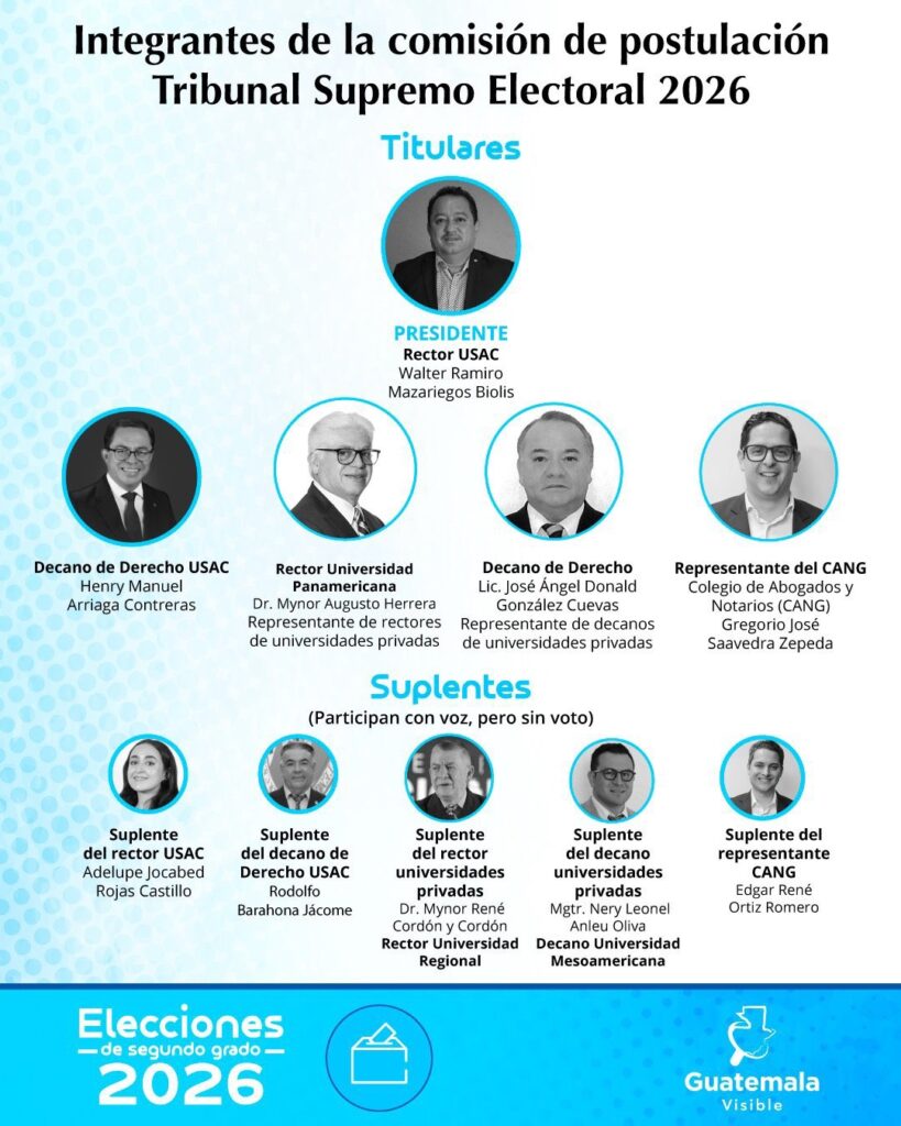 Con esta elección, queda integrada la Comisión de Postulación que deberá entregar al Congreso de la República una nómina de 20 candidatos, de la cual los diputados designarán a los próximos magistrados del Tribunal Supremo Electoral para el período 2026-2032.
