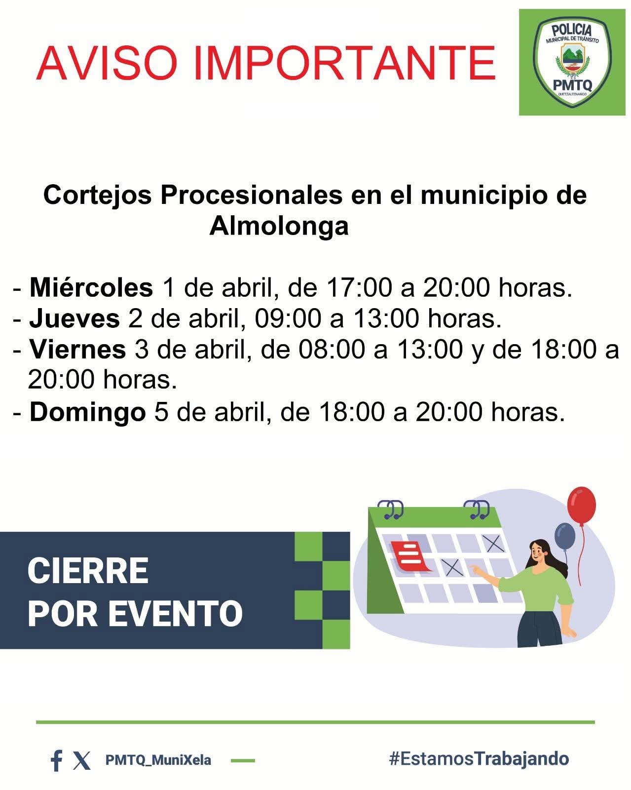 Este Miércoles Santo la Policía Municipal de Tránsito de Quetzaltenango (PMTQ) anuncia cierres viales en Almolonga, debido a cortejos procesionales por Semana Santa.