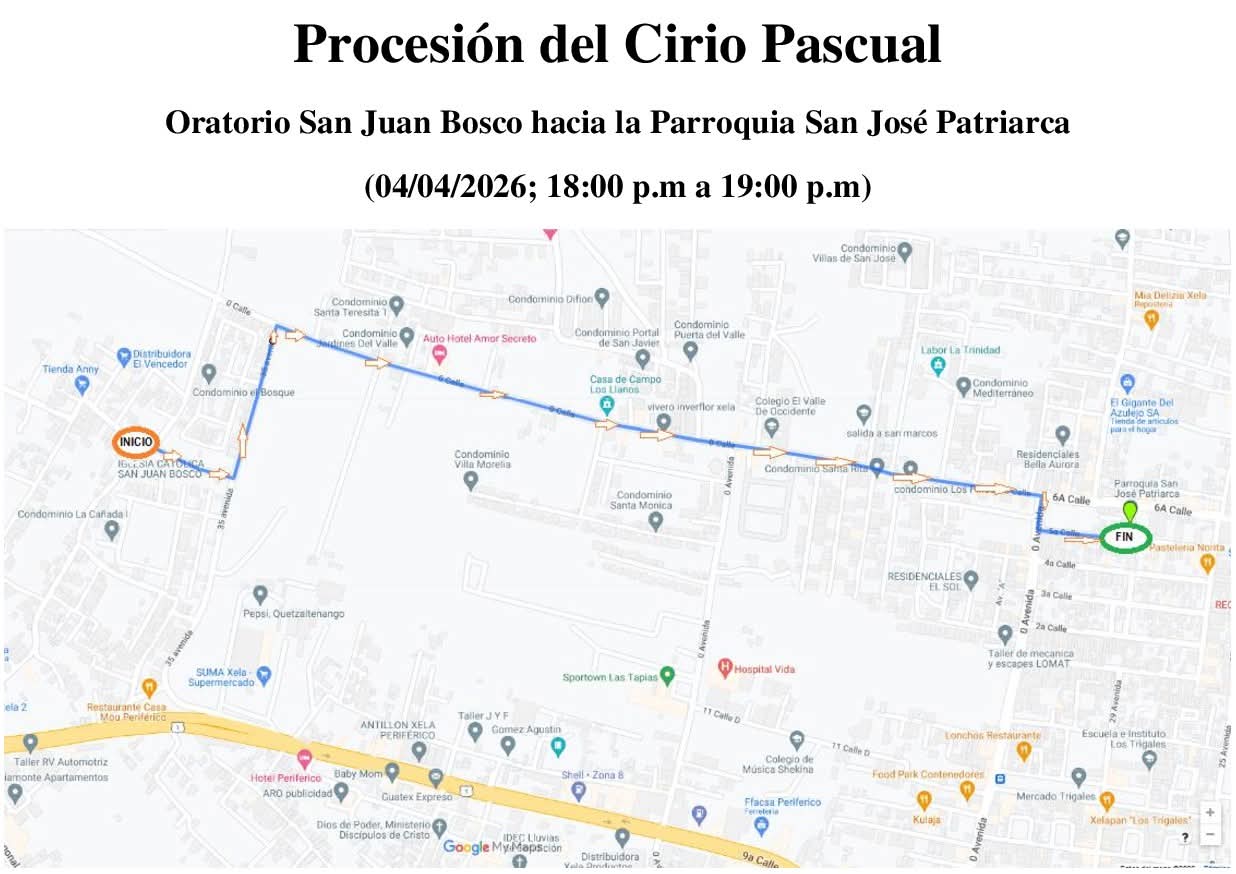 Debido al paso del cortejo procesional del Cirio Pascual, el cual inicia en el oratorio San Juan Bosco, zona 8 de Quetzaltenango, hacia la parroquia San José Patriarca, zona 7, anuncian cierres viales.